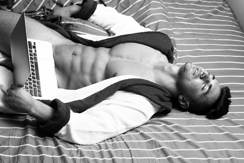 Když mám všechno připravené jdu do koupelny umýt a upravit své tělo, už ve vaně plné voňavé pěny při pomyšlení na dnešní večer se mi topoří můj obr, je to skutečně macík, mám problémy ho udržet, a zkrotit ještě před započetím krásného večera. Po koupeli na mokré tělo beru župan, a jdu do pokoje, naliji si skleničku a při svíčkách přemýšlím o dnešním večeru. Svlékám si župan, pouštím kameru a ulehám na čistou postel, rukou si projíždím po nahém opáleném těle prsty masíruji bradavky a vzrušením mi tvrdne penis. Mé ruce opouštějí bradavky a věnují se již úplně tvrdému penisu, jednou rukou stahuji předkožku druhou masíruji pytlík s koulemi. Přestávám masírovat koule, a začínám stahovat kůžičku na penisu nahoru dolu, přidávám na rychlosti, no prostě masturbuji, když cítím, že se blíží vyvrcholení, přestávám, a nechám svůj pyj lehce zvadnout.